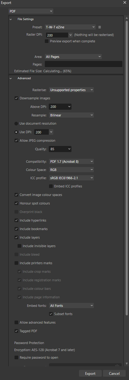 Create a preset so that you can recall these settings on exporting. Note that the setting for 'Area' is not saved in the preset and defaults to spreads so remember to change it back to 'All Pages' before exporting the PDF.